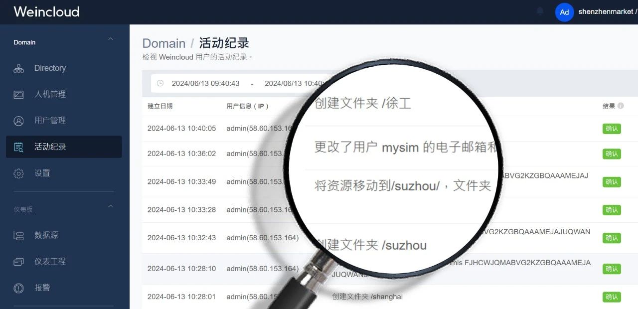 除了靈活的權限管理,Weincloud 還提供詳細的活動記錄,幫助管理者采集用戶行為,包括登錄記錄、密碼修改、權限更改…等。這有助于提升系統(tǒng)的安全性,憑借著完整的人員行為追蹤,確保快速找到發(fā)生各種異常的原因。